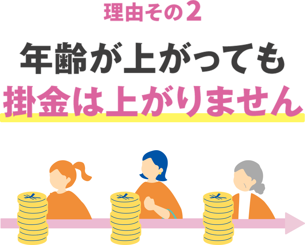 年齢が上がっても掛金はご加入時の金額のまま、85歳まで保障が続きます。※年齢区分に応じて保障内容が変わります。